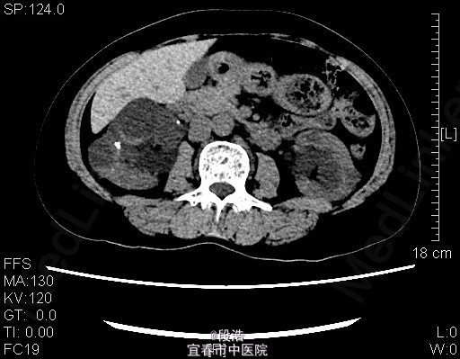 5、诊断:多囊肝,双侧多囊肾,双肾多发结石 6、入院后完善相关检查,生化,心电图,胸片未见异常,复查ct提示多囊肝,双侧多囊肾,双肾囊壁部分钙化;双肾多发结石,排除手术禁忌症后,行腹腔镜下左肾囊肿去顶术,术后予“注射用头孢美唑钠(先锋美他醇)”抗感染、抑酸、静脉营养补液等处理,术后恢复良好,顺利出院。术后半年复查再决定另一侧的处理方式。