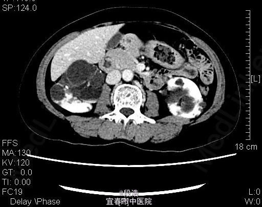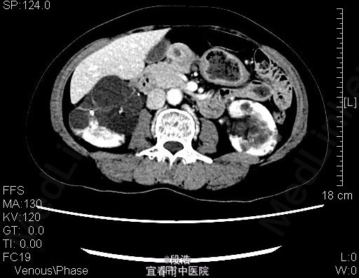 1、中年女性,体检发现双侧肾囊肿2年 2、患者于2年余前至当地医院体检发现双侧肾囊肿,当时诉腰部稍酸胀,尿量稍增多,无尿频、尿急、尿痛,无排尿困难,无血尿、脓尿等。起病以来,患者一般情况尚可,体重无下降