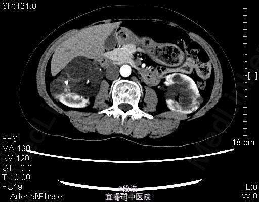 3、查体:未见明显异常 4、辅助检查:2013-4-11我院中腹部CT结果考虑多囊肝(未给出图像),双侧多囊肾,双肾囊壁部分钙化;双肾多发结石。2015年5月复查结果同前。