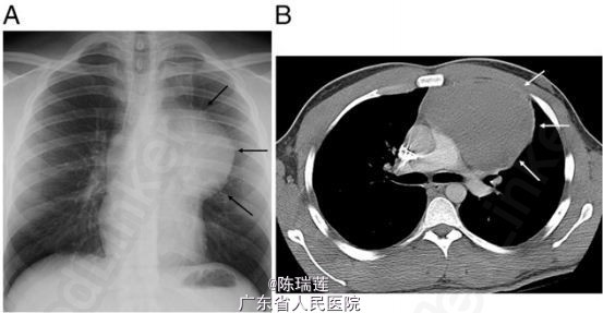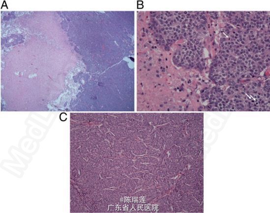 生命征未见异常,体查结果均正常,包括无睾丸病变,无淋巴结病变和无甲状腺肿大。胸部听诊,呼吸音清,无心脏杂音。腹部体查无肝脾肿大和无血管杂音。无皮肤病变。 胸片可见左纵隔肿物(图 1A)。进一步采用 CT 增强扫描可见前纵隔有一 10×7cm 的密度均一的肿物(图 1B)。 实验室检查:乳酸脱氢酶,α- 胎蛋白,β2 微球蛋白,促甲状腺素,甲状旁腺素,钙离子浓度,黄体生成素、卵泡刺激素均正常。淋巴瘤和 HIV 检测均阴性。 组织病理学可见肿瘤细胞形态均一,细胞核呈圆形,染色质均一。在坏死区域,每 10 个高倍视野可见 7 个细胞分裂象(图 2)