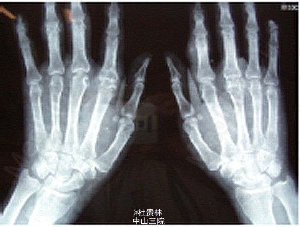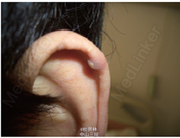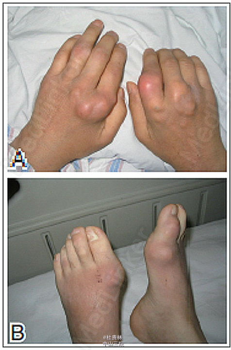 贫血貌,双侧眼睑轻度水肿,双耳廓见米粒大小硬结(图1)。双下肢轻度浮肿,双手第一掌指关节明显红肿,皮温 升高,拒触摸。双手掌指关节、双足第一跖趾关节明显变形,活动受限,双手及双足可见数个鸽蛋大小结节,质软 BUN 15 mmol/L,SCr 200μmol/L,血尿酸720 μmol/L。