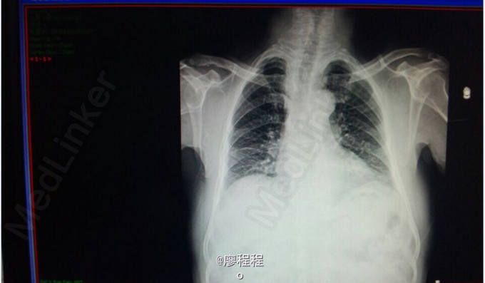 查体:生命体征平稳,神清,唇红,颈静脉无充盈,心音低钝,心尖部闻及收缩期吹风样杂音,双肺呼吸音稍粗,余查体无特殊。 辅助检查:胸部正位X线