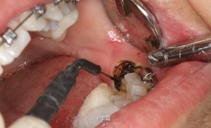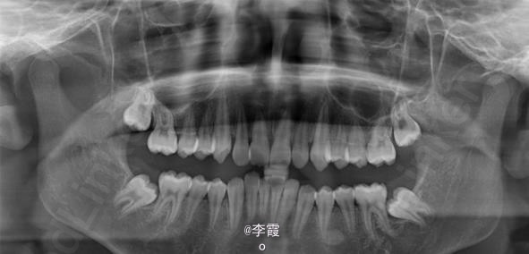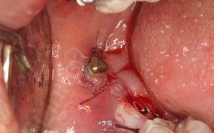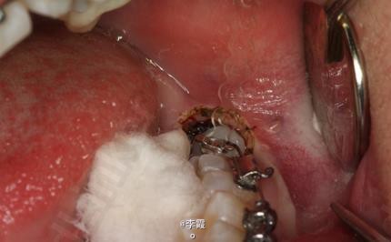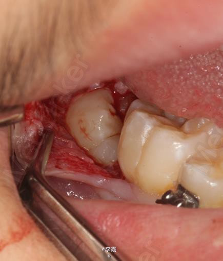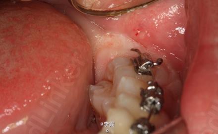 患者、马xx、15岁,主诉:牙齿不齐,要求正畸治疗。 转诊外科行下颌升支处种植体支抗直立下颌磨牙。通过患者的术前影像资料,47牙冠远中有部分骨质覆盖牙冠,采取翻瓣导萌直立磨牙。37采取电刀环切导萌直立磨牙。