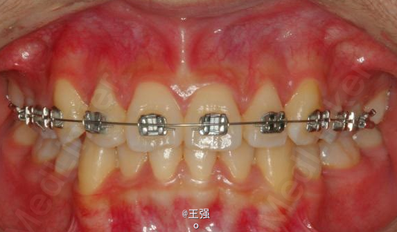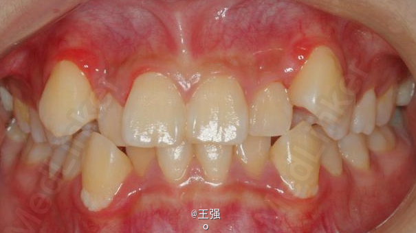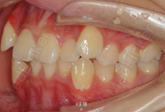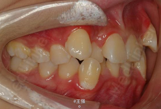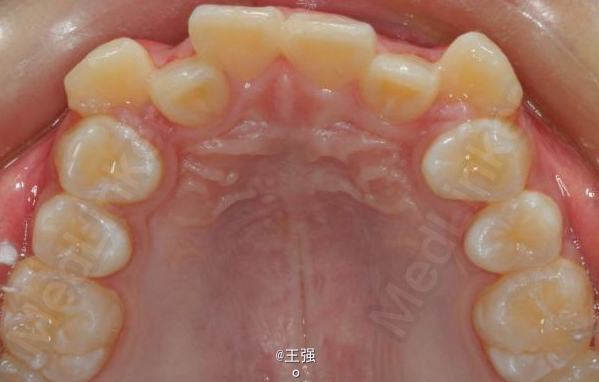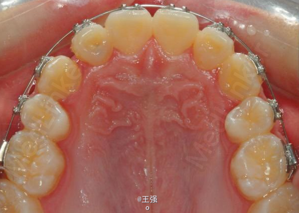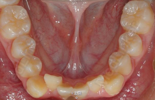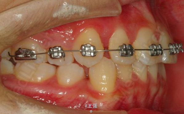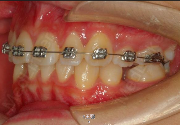 在临床上,我们常常会遇到亚类病例,对于亚类病例,有时需要不对称拔牙,常见的不对称拔牙方法有:上颌对称,下颌数目对称但是位置不对称。还有上颌对称,但是下颌数目不对称。其目的就是为了取得尽可能理想的尖窝对应咬合关系 该病例右侧是中性关系,左侧是中性偏远中关系,上颌中线正,下颌中线左偏约1mm。左侧磨牙关系距离中性关系约差2mm左右。如果采用对称性拔除下颌左右四,我们面临的问题是,一、如何保证矫治后上下中线一致,二、如何保证左侧磨牙关系矫治后为中性关系。治疗过程中势必会用到不对称牵引。我个人认为除非是功能性的因素,矫治过程中最好不要用不对称牵引。 关于中线和磨牙关系的问题,我认为应在矫治计划制定时就应考虑到,而不是等到矫治第三阶段所谓精细调整阶段再来解决。事实上到了这个阶段采用了不对称的牵引,即使暂时取得了中线对齐的矫治目的也是不稳定的。 这个病例,用了不对称的拔牙,右下拔四,左下拔五。下颌牙齿在漂移的过程中(几乎没有外来力量),下前牙自然就会向右比向左多漂移一些,中线在下颌还没有开始矫治时就对齐了,左下六因没有五的存在,自然就向近中多漂移一些,和上颌六形成中性关系。接下来的矫治就会非常简单,而结果自然也非常稳定。