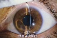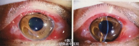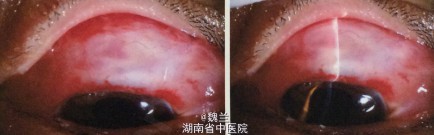 右眼角膜透明,中央前房深度4CT,周1/2CT,房水无混浊,瞳孔约3×3mm,晶体透明,C/D=0.3,视网膜平伏。 左眼结膜轻充血,滤过泡轻度隆起,2根调整缝线在位,角膜透明,中央前房深度4CT,周1/2CT,房水轻度混浊,虹膜周切口通畅,瞳孔约3×3mm,晶体透明,C/D=0.3,视网膜平伏。 炎症继发青光眼,术前术后控制炎症反应,减轻术后结膜瘢痕化而导致的滤过泡失败。