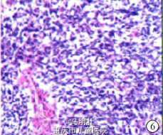 完善相关检查后予手术处理。术中情况:盆腔内肿物,位于脊柱两侧,腹主动脉前方,包裹左髂内,外动静脉及左侧输尿管,输卵管,外有包膜,包膜不完整,20cm×10cm×10cm,形状不规则,质稍硬,囊实性,活动度差(图5)。病理诊断:(腹部)肉瘤,符合恶性蝾螈瘤。镜下观:可见成束状或网状分布的梭形肿瘤细胞,即神经鞘膜瘤细胞,核分裂象数多,核大小不一,异型性明显,细胞质稀少,粉染。横纹肌肉瘤样细胞散在分布,异型性明显,间有粘液样基质,胞质丰富红染,部分胞质内可见到横纹,核大,嗜酸性(图6)。免疫组化:S-100(+);Desmin(+);myoglobin(+);NF(+);Ki-67(+50%)。手术过程均较顺利,肉眼所见肿瘤均完整切除,术中探查均未发现其他部位可疑病灶。术后恢复良好。