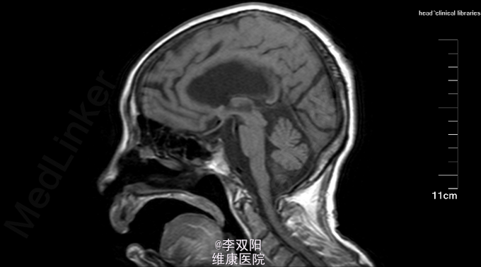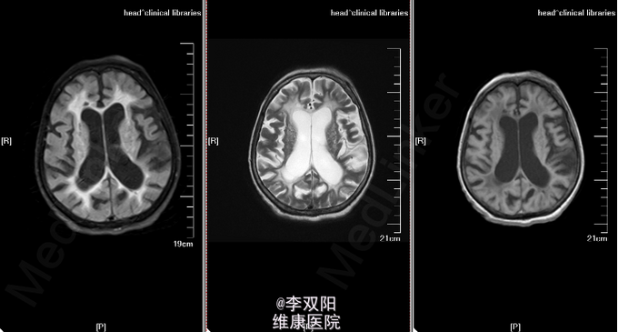 查体:体温36.2℃,脉搏58次/分,呼吸20次/分,血压150/90mmHg。轮椅推入病房,查体合作。皮肤巩膜无黄染,双肺呼吸音清,未闻及罗音,心率58次/分,律齐,无病理性杂音,腹部平软,肝脾肋下未触及。 神经系统专科查体:神志模糊,失语,双瞳孔同大同圆,直径3.0mm,对光反射灵敏,眼球各方向可活动,无眼震及复视,鼻唇沟对称,咽反射(+),伸舌不合作,四肢肌力2级,肌张力增高,肱二头肌、肱三头肌肌腱及膝反射、跟腱反射均对称,感觉及共济运动检查不合作,Hoffmann征L(-),R(-),病理征:Babinski征L(+),R(+),颈无抵抗,Kernig征(-)。 辅助检查:头颅CT扫描示:双侧基底节区及丘脑区斑片状低密度影,双侧脑室周围及双侧半卵圆中心见片状密度减低区,边缘模糊不清。双侧脑室扩张,脑沟裂增宽,中线结构居中。 头MRI+DWI:双侧基底节区及丘脑区斑片状低密度影,双侧脑室周围及双侧半卵圆中心见片状密度减低区,边缘模糊不清。双侧脑室扩张,脑沟裂增宽,中线结构居中。