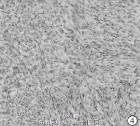 患儿在全身麻醉下,于出生后3 d行头皮肿瘤根治性切除手术。术中沿瘤体表面头皮梭行切开,双极电凝止血,探查见瘤体具有包膜,与头皮可解剖分离。基底部与帽状腱膜界限不清,但帽状腱膜下分离满意,后失状窦处未侵犯颅骨,其基底部无穿支血管(图3)完整切除肿瘤,修剪头皮,留置引流,缝合满意。 患儿于术后7 d顺利出院。术后病理检查报告:头皮纤维肉瘤。显微镜下可见梭形细胞周围致密胶原聚集及车轮型组织细胞(图4),伴有散在出血、坏死,毛囊周围亦有侵犯,并可见广泛的中度有丝分裂。S-100(个别细胞+),SMA(一),CD34(血管+),Vimentin(+),Ki67(+,60%),CK(一),P53(散在+),Desmin(一)。