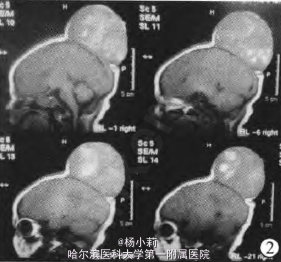 查体:无明显贫血貌,头顶部巨大隆起半球型肿块,直径约12.0 cm,肿块边界清楚,头皮不红,肿块中心部位头皮约2.0 cmX 2.0 cm范围破溃、结痂、渗血。肿块较固定,质地韧。(图1) 实验室检查:AST 95.70 U/L,a羟丁酸脱氨酶(HBDH)524.6 U/L;WBC 13.94×109/L,N 0.75,Hb 114 g/L;AFP:294.4μg/L(正常参考值0~6.4μg/L)。MRI检查示:双顶可见巨大团块,T2w及T1w呈等信号,内可见斑片状高低混杂信号,与附近脑组织分界清除,脑室系统未见扩张(图2)。