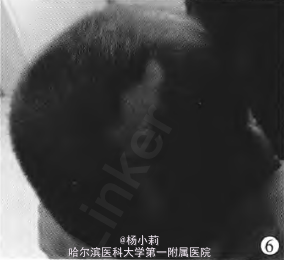 随访:术后3个月及12个月复诊,头皮局部愈合良好,未见复发(图5、6)。血AFP分另Ⅱ为134弘g/L和11.6 pg/L。 讨论:纤维肉瘤属软组织恶性肿瘤,好发于四肢远端,其次为躯干和头颈部。其中,头皮纤维肉瘤属头皮间叶细胞肿瘤。由于术后病情得到缓解及有效化疗药物的不断应用,使得本病患病率有所增加,但国内尚未见确切统计报告。 目前,本病的病因仍不清楚。有报道在头皮照射,烧伤疤、外伤以及头皮良性肿瘤手术后,发现头皮纤维肉瘤。对于头皮纤维肉瘤,外观无明显恶性特点的病例,多需病理检查才能获得确定诊断。彩色超声检查可以提供瘤体的血供情况,对于手术中控制出血有指导意义。头部CT及MRI检查可帮助判断瘤体是否侵犯颅骨及颅内有无病灶等。 本例特点为:①为先天形成的恶性肿瘤,出生后即发现巨大瘤体,且瘤体头皮有破溃及结痂形成,表明肿瘤细胞生长极其迅速;②头部MRI检查发现在后矢状窦处与颅内分界不清,不能判断是否有颅内侵犯;③肿瘤在影像学检查及术中均未见明显颅骨侵犯、破坏。在病理学上,本例显微镜下可见梭形细胞周围致密胶原聚集及车轮型组织细胞,伴有散在出血、坏死,毛囊周围亦有侵犯,并可见广泛的中度有丝分裂。血供不象恶性血管内皮瘤丰富。头皮纤维肉瘤的治疗原则为手术切除。肿瘤完全切除是手术金标准,部分肿瘤切除后极易复发,但临床观察发现,除少数晚期病例外,很少有头皮纤维肉瘤患儿发现远处转移。