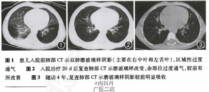 随访:出院后随访4年。患儿仅口服孟鲁司特治疗1年,气促逐渐好转;第2年气促减轻;第4年气促症状消失。期间患儿曾有过1次喘息(冬季感冒后),平素活动耐受尚可,无明显喘息及气促。 讨论:本病诊断的金标准为肺活检,但其母亲考虑到患儿年龄较小,行肺活检对患儿创伤较大,故拒绝接受此检查。本病出院时并未能获得正确诊断,提示临床医生长期咳嗽激素无效不能缓解应考虑该病。