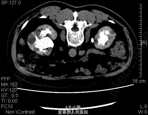 5、诊断:双肾多发性结石 6、处理:入院后完善相关检查,如上述,胸片、心电图未见异常,予以头孢哌酮钠舒巴坦钠+乳酸环丙沙星联合抗感染治疗,控制血压及血糖后,患者一般情况稳定,行右侧经皮肾镜取石术,术后予以抗感染、补液等对症支持治疗,患者恢复良好,顺利出院,待半年后再行另一侧手术,住患者出院后定期复查。