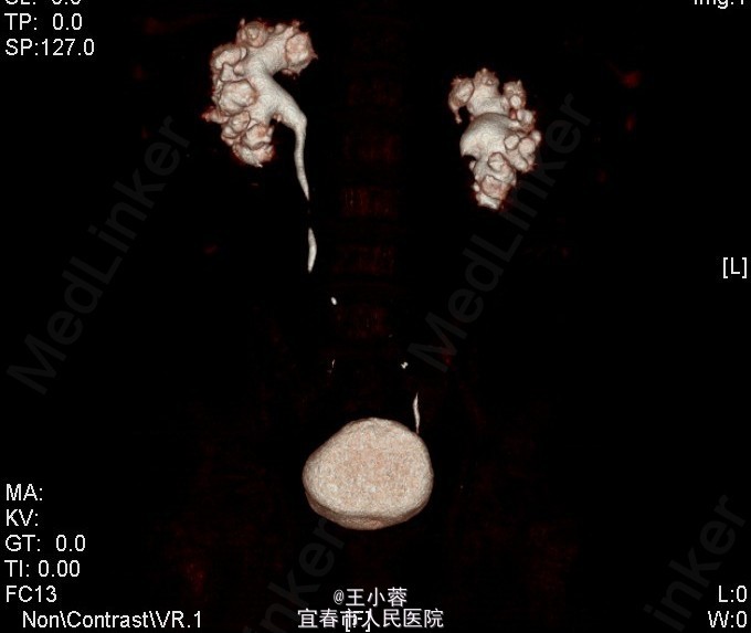 3、查体:未见明显异常 4、辅助检查:当地人民医院泌尿系彩超示:双肾多发结石(未见报告),我院肌酐124.2umol/L,糖6.62mmol/L。我院双肾CTU:1、双肾铸型结石,双肾中度积液,双肾功能减低;腹膜后多发稍大淋巴结。2、多囊肝,多囊肾,双肾多发复杂性囊肿。3、慢性胆囊炎。4、腹主动脉及双侧髂动脉硬化