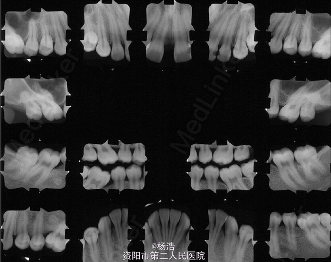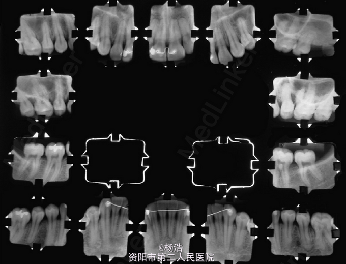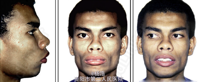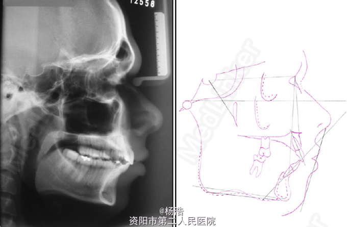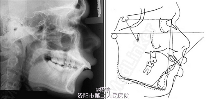 凸面型,面下1/3短,唇前突伴下唇前突,颏肌紧张,TMJ正常,上颌中切牙间5mm间隙,下中线右偏1mm,唇休息位和闭合位上中切牙都因前突而暴露。覆盖14mm,深覆合 根尖片示上下颌四个6都因龋坏拔除 侧位片:短面型,低角,严重骨性II类,ANB:9°