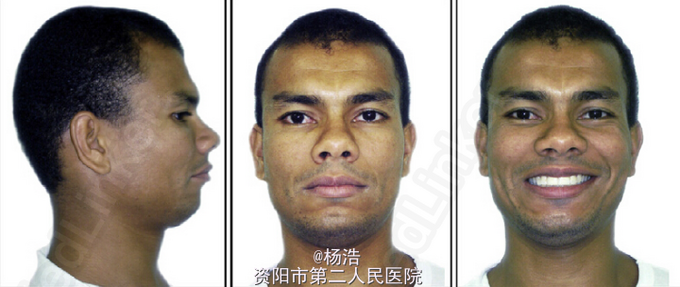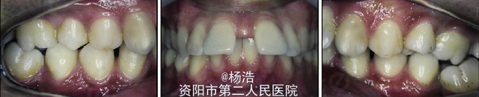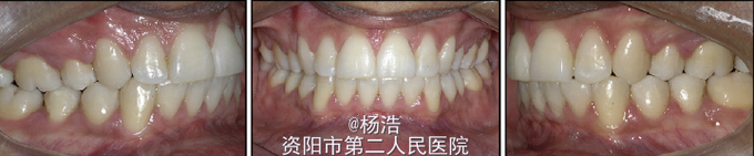诊断:骨性II类,上颌前突,牙列间隙 治疗目标:排齐整平上下牙列,维持第二磨牙II类关系,建立尖牙I类关系,建立前牙正常覆合覆盖,达到面部协调美观。 处理:建议患者正合手术,患者拒绝,选择正畸掩饰治疗,拔除上颌两个4,定向力矫治+种植钉支抗,最大限度内收上颌牙列,同时压入牙列,建议正畸完成后行颏成型术,但患者仍拒绝种植钉和颏成形术,所以粘接方丝拖槽,用Tweed-Merrifield定向力技术矫治,拔除上颌两个4,戴用高位牵引J钩作为前牙内收的支抗控制和压低前牙。 矫治疗程稍长36个月,但效果好,以7代6, 8代7,磨牙达到预期的II类完全远中关系,尖牙中性关系,中线改正,咬合良好,正常覆合覆盖,面型改善大。