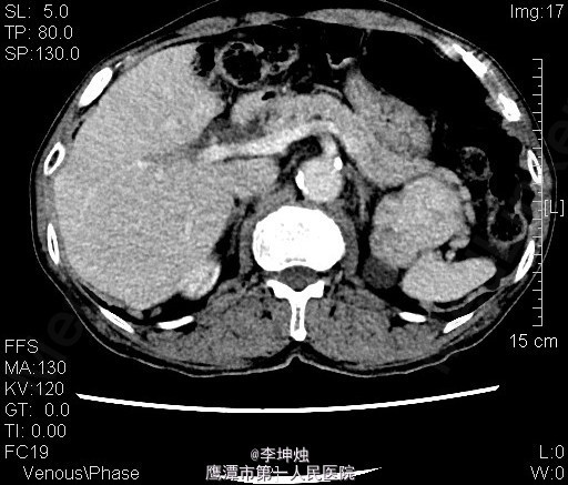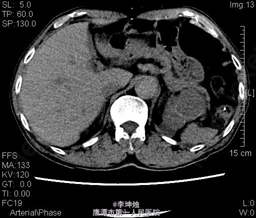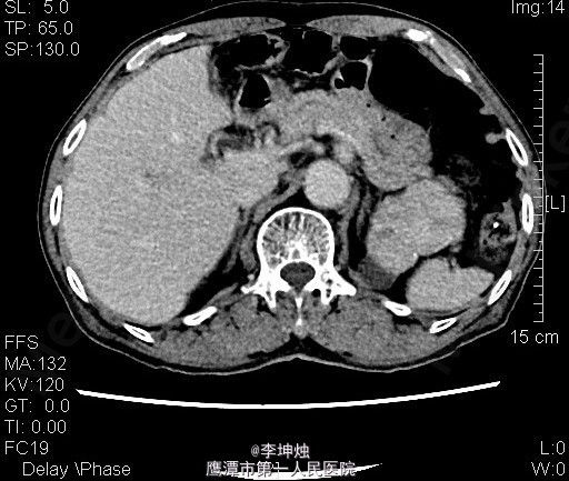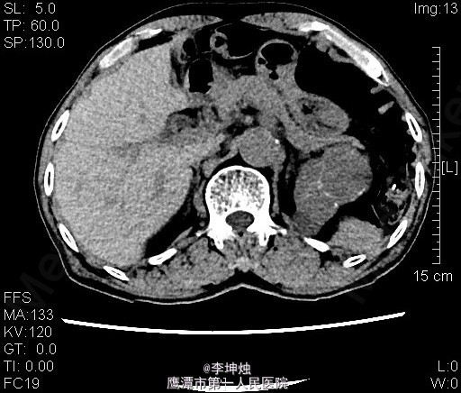 3、查体:增加腹压或站立位时右侧腹股沟隆起,可触及一大小约4*5cm肿物,可进入同侧阴囊,质软,边界清,无压痛,压迫肿物表面后嘱患者咳嗽,有冲击感,平卧或用手可将肿物回纳腹腔。直肠指检:肛门括约肌稍松弛,前列腺明显增大,大小约:3×4cm,表面光滑,质韧,边缘清楚,中央沟变浅,未触及明显结节,指套未见染血。 4、辅助检查:当地人民医院,腹部CT提示考虑左肾Ca可能;慢性膀胱炎;右侧腹股沟区见肠管嵌如;前列腺增生。我院双肾CT平扫+增强:左肾上极肿块,考虑肾癌,侵犯左肾上部皮髓质及左肾上盏,可疑侵及胰尾部。