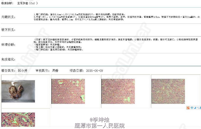 5、诊断:左肾占位,左肾ca? 6、处理:入院完善相关检查,核素肾动态显像:双肾灌注轻度降低、功能中度受损。双肾+肾上腺CT:左肾上极肿块,考虑肾癌,侵犯左肾上部皮髓质及左肾上盏,可疑侵及胰尾部。排除手术禁忌后,行“腹腔镜下左肾根治+肾门淋巴结清扫术”,术后予“头孢哌酮钠舒巴坦钠(舒普深)”抗感染、抑酸、营养补液等处理,术后恢复可。病理提示嗜酸性细胞瘤。