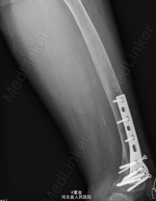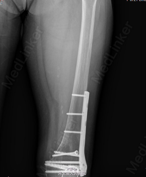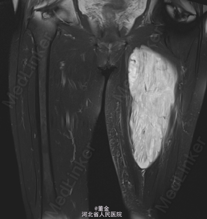 左大腿内侧可见大面积肿块,质硬,活动可,无压痛,表面皮肤无破溃。四肢末端麻木感,末梢血供正常,病理征未引出。MR1.左大腿肌间隙恶性肿瘤,平滑肌肉瘤可能性大,神经鞘瘤恶变待排。2.左股骨下段内固定术后。DR:腰椎内固定术后改变.