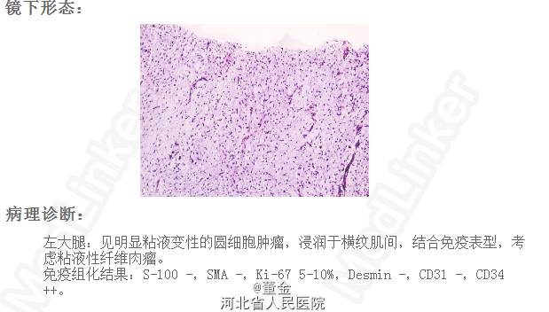 术后病理:(左大腿)恶性肿瘤,结合原活检免疫组化,粘液纤维肉瘤首先考虑,粘液脂肪肉瘤待排,待分子检测排除粘液脂肪肉瘤。周围软组织切缘阴性。