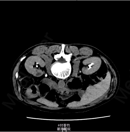 双肾区无红肿、隆起,无叩痛,双侧肋脊点、肋腰点无压痛。腹平软,双侧上中输尿管点无压痛,膀胱区无压痛。双侧腹股沟区未触及肿物 入院后查双肾CTU:膀胱结石,慢性膀胱炎,膀胱少许积气;左肾下部病灶,考虑良性病变,复杂囊肿可能大;双肾多发囊肿;前列腺电切术后改变,残留前列腺钙化