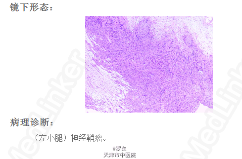 患者,男,35岁,因“发现左小腿病损3年”入院。 患者3年前无明显诱因下出现左小腿一肿块,当时如豌豆大小,遂前往当地医院检查,B超提示左小腿一1.0*1.0CM肿块,当时未予重视,近3年来肿块逐渐增大,且患者偶感左小腿酸胀不适.
