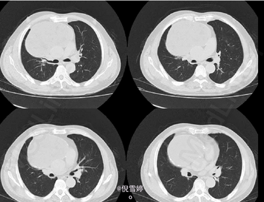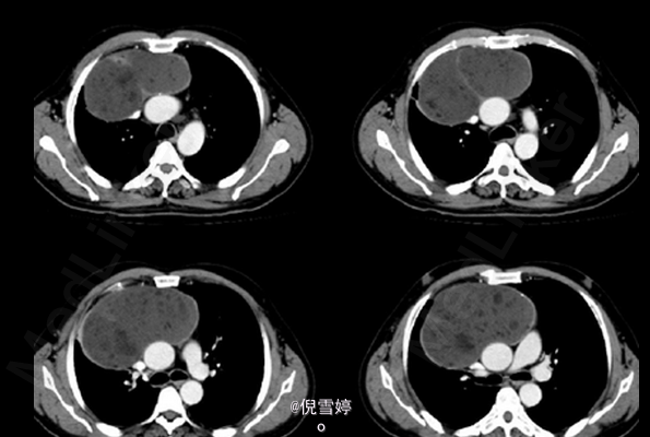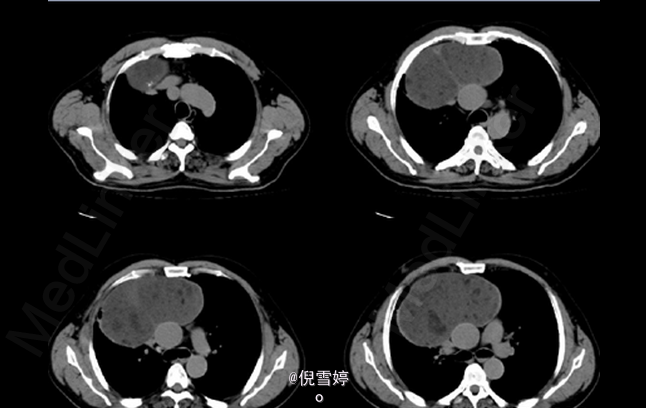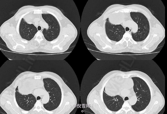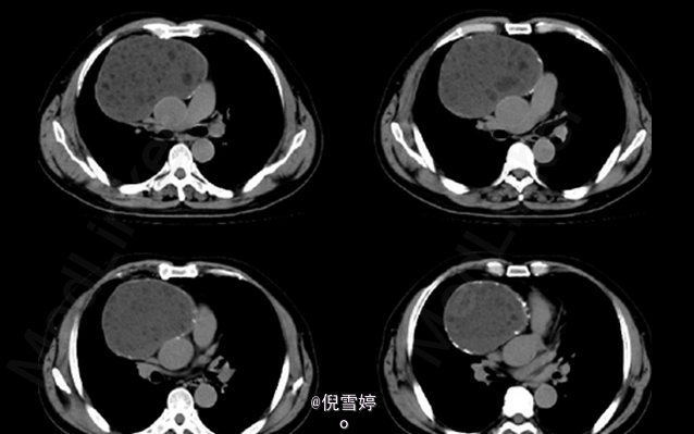 患者除胸部不适外并无其他明显症状 辅查CT,右前纵隔囊性占位,多发脂肪样密度,病理检查良性