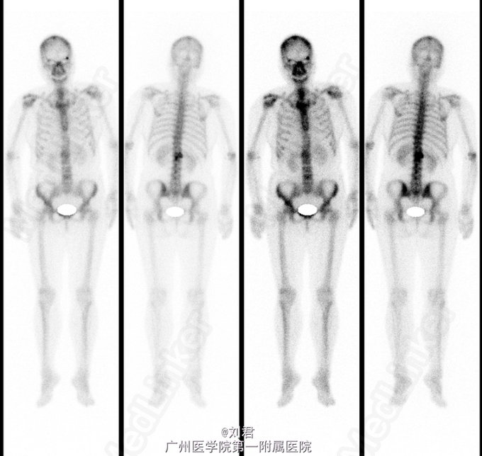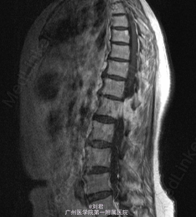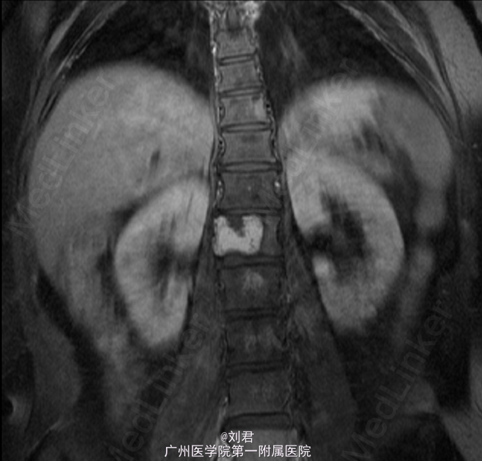 脊椎外观无畸形。胸腰椎无明显压痛、叩击痛。双下肢直腿抬高试验阴性,双下肢感觉无异常,肌力、肌张力正常。腰椎椎间盘扫描:腰1椎体肿瘤,考虑椎体血管瘤可能。建议增强MRI扫描观察。腰椎磁共振增强扫描:腰1、2肿瘤,倾向于恶性肿瘤,转移?骨髓瘤?