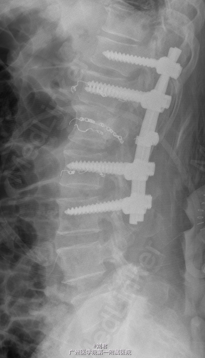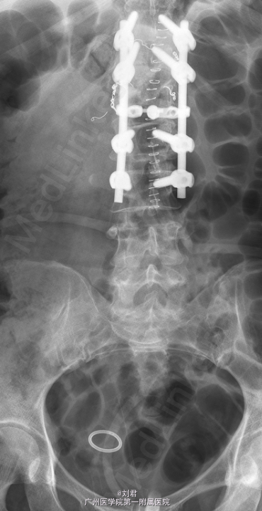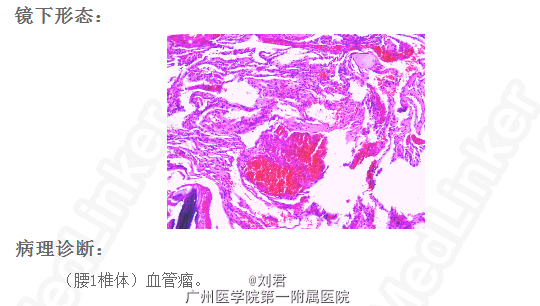 术后病理:(腰1椎体)血管瘤。术后予抗感染、止痛等治疗。患者术后恢复可,复查腰椎X片示内固定位置可.