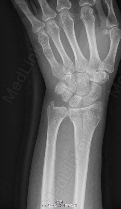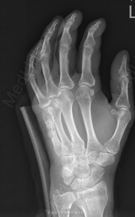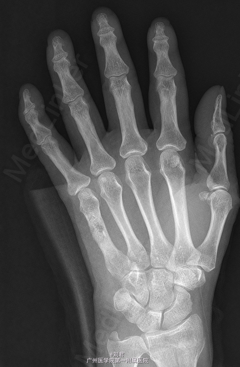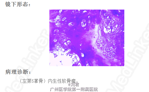 初步诊断:1、 左桡骨远端骨折,2、左手第5掌骨软骨类肿瘤。在臂丛复合静脉麻醉下行“左掌骨内生软骨瘤切除术”,手术过程顺利,术后予以对症治疗。