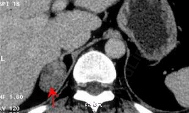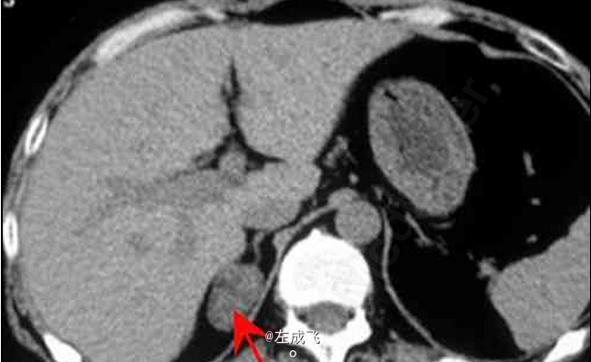 患者体检时偶尔发现右肾上腺区肿块,无其他明显症状 辅查CT,平扫示右肾上腺类圆形肿块,边界清楚;增强扫描呈不均匀强化