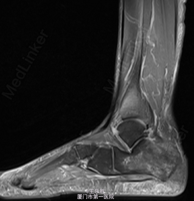 左足跟轻度肿胀,局部皮肤无红肿及皮温升高,轻压痛,左足背动脉搏动存在,肢端血运感觉正常,足趾活动尚可。MRI提示:“左足跟骨水肿”.