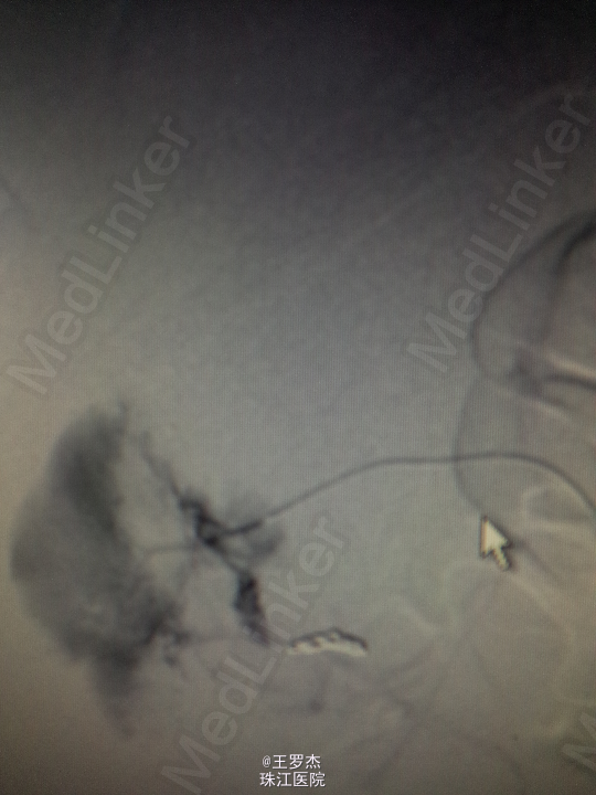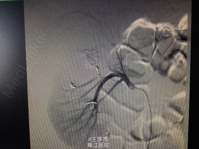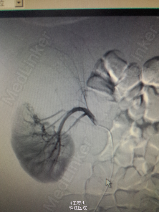 诊断治疗:右肾挫裂伤,保守治疗。3天后复查Hb89g/L,RBC2.65;复查CT提示包膜下及盆腔积血较前增多。请介入科会诊,行右肾动脉选择性栓塞。 介入:右肾挫裂伤,并上极动脉破裂出血及远端多处动静脉瘘形成,成功行超选择性病变血管栓塞术。
