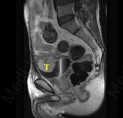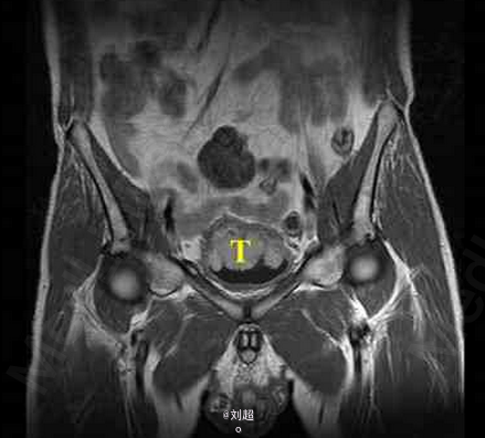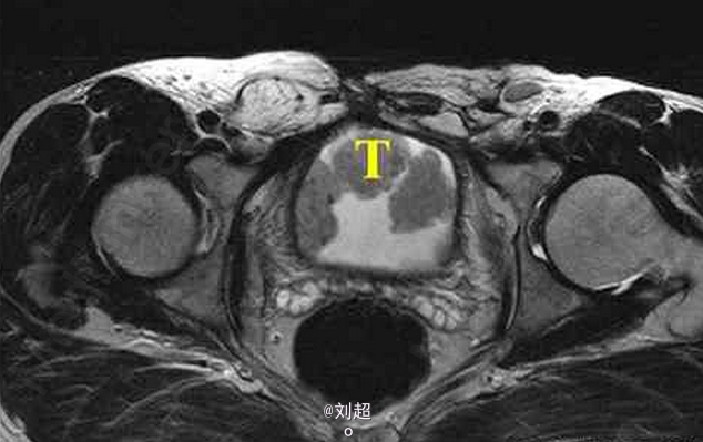 患者尿频、尿急、尿痛,有肉眼可见血尿 辅查MRI,平扫见膀胱侧壁和前上壁呈菜花样突入腔内,T1WI呈低信号,T2WI呈稍高信号,增强后肿块明显强化