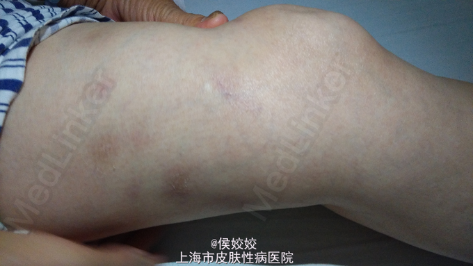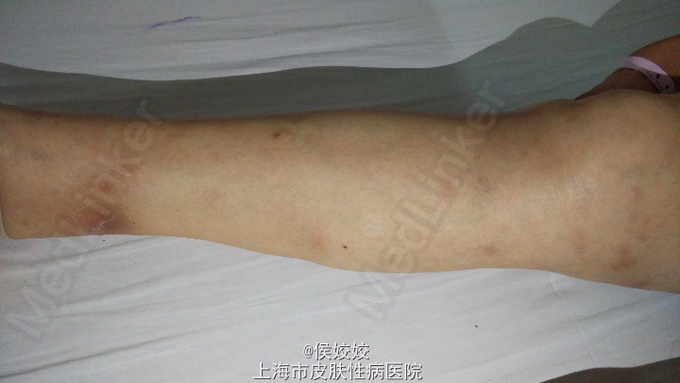 患者,女,64岁,因“双下肢起疹1月余”入院。 患者1月前无明显诱因双小腿起疹,伴压痛,当地医院就诊,诊断为“结节性红斑”,给予芦丁片、青鹏软膏等治疗半月余,无明显效果 既往无特殊