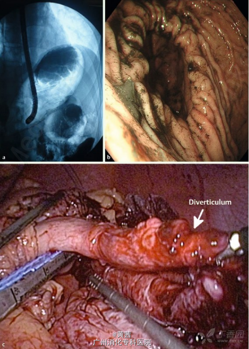胃憩室为罕见病,文献约有 200 例报道 [1],发病率 0.01%-0.11%[2,3],无性别差异,发病年龄 20-60 岁不等,大部分患者无症状,但是可出现出血、穿孔等并发症 [1, 2, 4]。胃憩室可为先天性或后天性 [5],前者为真憩室,约占 72%[4],常位于食管胃连接处 2-3cm 范围内,其发生与胎儿畸形或胚胎发育中断有关;后者为假憩室,仅被覆粘膜层,发生可能与胃出口梗阻、反复呕吐、急性胆囊炎、胰腺炎及肝、脾黏连有关。对于有症状患者,建议行手术切除,腹腔镜下憩室切除术为首选。 来源:http://gi.dxy.cn/article/66338