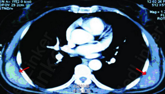 患者,女性,年龄64岁,“发现双侧肩胛下角包块6年,双侧包块部位疼痛2月”入院,既往史无特殊。家族史:患者有一姐姐10年前行右侧肩胛下角区包块切除,术后病理为弹力纤维瘤,术后5年左侧肩胛下发现硬质包块,考虑弹力纤维瘤,未手术。
