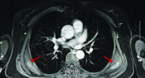 查体:双侧肩胛下角区域可扪及一直径约5cm 硬质类圆形包块,固定。余无特殊。 CT提示:双侧背阔肌及前锯肌深面对称性病变,增强后不均匀强化,周围脂肪间隙清楚。 MRI示::双侧对称性病变,位于背阔肌及前锯肌深面,增强后斑片状强化,周围脂肪间隙清晰,局部与肋骨骨膜关系紧密。