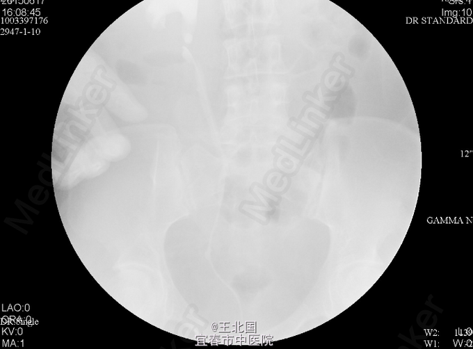 5、诊断:输尿管结石 6、处理:入院后完善相关检查:腹平片及静脉泌尿系造影均提示:右侧输尿管下段结石,右肾及右输尿管中重度扩张、积液,右肾功能减退低。行“右侧输尿管镜碎石取石术”,术中取尽结石后,见右侧输尿管迂曲,进镜及进导丝困难,后留置4F输尿管支架管一条。术后行泌尿道逆行造影,见右侧输尿管迂曲,造影剂通过正常。患者术后恢复可,顺利出院