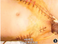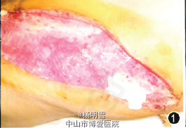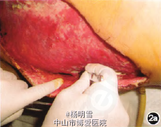 人院后行急诊手术,术中见肛周、双侧腹股沟、左侧腰腹部皮下浅筋膜及阴囊内充满黑褐色絮状坏死组织,散发恶臭。切开肿胀有捻发音处,清除坏死组织,并取脓液送检做细菌培养,使用双氧水、生理盐水、甲硝唑液依次冲洗干净,置皮下引流管于左侧腰腹部与肛周浅筋膜层,术后给予抗休克、抗感染、补液、纠正酸碱平衡和电解质紊乱等对症治疗。术后诊断为肛周脓肿、阴囊坏疽伴广泛急性坏死性筋膜炎、感染性休克。术后患者仍反复出现阴囊肿胀,并扩散至右腰腹部、左侧腋下及胸壁,行急诊手术,术中见左侧阴囊已基本全部坏死,睾丸局部少许坏死,清除坏死部分,将其置于左侧腹股沟上,右侧仅残余少量正常阴囊组织,左侧腹部伤口内有褐色渗出,进一步扩创清除并冲洗引流。术后送ICU监护。入院第7天患者血氧饱和度好转,体温稳定,返回普通病房继续治疗。术后经每日伤口换药,有炎性分泌物及坏死组织处及时清理,并用双氧水、生理盐水依次冲洗,0.5%活力碘擦拭,喷抹护创液,0.5%甲硝唑或烧伤三号纱条湿敷。同时用敏感抗生素、输注白蛋白,调节电解质平衡等补液对症治疗。