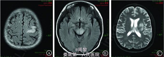 入院体检 :体温37 ℃,心率70次/min,呼吸16次/min,血压96/62 mmHg。双肺呼吸音清,未闻及干湿性啰音。心律规整,各瓣膜听诊区未闻及病理性杂音。神经系统检查 :意识清楚,言语清晰,双侧瞳孔等大等圆,直径约 3 mm,对光反应灵敏。额纹对称,右侧鼻唇沟变浅,伸舌居中。右上下肢肌力 4+ 级,左上下肢肌力 5 级,四肢肌张力正常。双侧 Babinski 征( -。脑膜刺激征阴性。CD4+ T 淋巴细胞检测结果 :CD4+62 个/μL,CD8+752 个/μL。HIV 病毒载量检测结果为83000拷贝/mL。血常规检查结果显示 :白细胞2.9× 10^9/L 、中性粒细胞2.1 × 10^9/L 、淋巴细胞0.6 ×10^9/L 、血小板180× 10^9/L 、红细胞 4.29×10^12 /L 、血红蛋白136g/L。CT 检查结果 :脑梗死。给予抗病毒、改善脑循环 、对症支持治疗,不见好转,病情加重,于 2013-01-08转入济宁医学院附属医院治疗。入院体检 :精神差,反应迟钝,言语迟缓。颈略抵抗。双侧瞳孔对光反应迟钝,右眼不能外展、上视 、下视,左眼内收 、外展受限,不能上视 、下视,无偏盲。右侧鼻唇沟变浅,伸舌右偏。右侧上肢肌力 0级,下肢3级,左手指鼻准稳。右偏身痛觉减退。双 Hoffmann征 、Babinski 征阴性,床旁吞水试验阴性。颅脑 MRI 平扫结果显示额叶 、顶叶、基底节、丘脑、左侧大脑脚 、延髓左侧见多发斑片状 、斑点状异常信号,呈长 T1 长 T2 异常信号,T2WI像 、FLAIR 像及 DWI 为高信号。小脑未见明显异常。MRA :未见明显异常。脑脊液检查 :无色透明,潘氏实验阳性,白细胞 4.0× 106 /L,蛋白720mg/L,葡萄糖4.5 mmol/L,氯化物 157 mmol/L,JC 病毒 DNA 阳性。