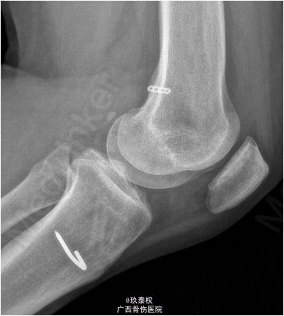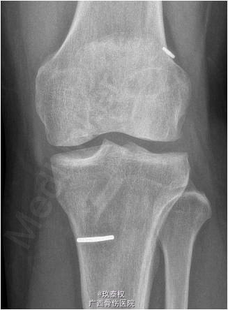 现患者随访1个月,左膝关节前抽屉试验(-),lachman征(-),已全面恢复日常活动。 前交叉韧带重建后的交叉韧带胫骨和股骨端固定,目前股骨端常采用Endobutton、生物横杆或生物挤压钉进行固定,而胫骨端常采用生物挤压钉和门型钉进行固定。术后半年后患者腱骨愈合良好的情况下可行门型钉拆除术。