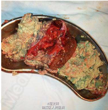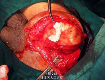 临床初步诊断:不可复性左侧腹股沟疝 行疝修补术 术中发现肿块伸出深环,到达耻骨结节,取出该肿块,切开肿块,有刺激性臭味并有泥样内含物,彻底切开后做病检