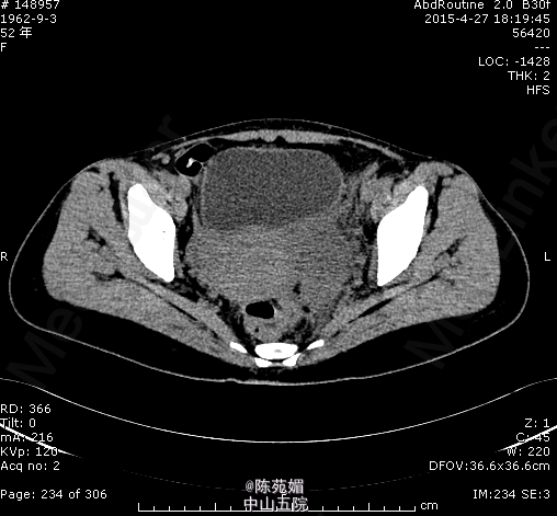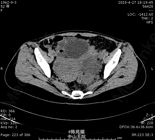 查体:腹壁平坦,中腹部可见一长约25cm陈旧手术疤痕,愈合可。腹软,下腹部轻压痛,无反跳痛。 辅查:暂缺。