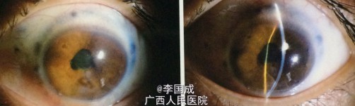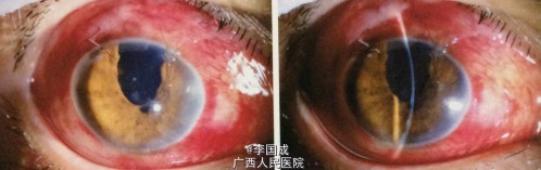 1.双眼葡萄膜炎继发性青光眼 2.左眼绝对期青光眼 3.双眼并发性白内障 4.双眼慢性葡萄膜炎 5.双眼瞳孔闭锁 处理:右眼小梁切除术+前房形成术+虹膜部分切除术+瞳孔粘连松解术