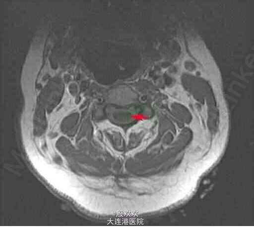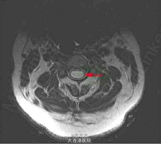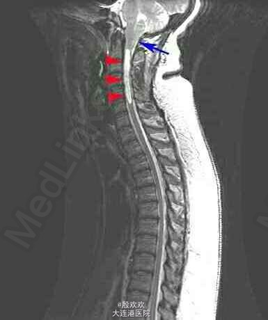 查体:生命体征平稳,双上肢皮肤粗糙。专科查体:神清,语利,双侧颈5-胸4水平痛温觉减退。双下肢肌张力稍高,右手骨间肌肉萎缩。双侧腹壁反射消失,双肱二头肌肌腱、肱三头肌肌腱、桡骨膜反射减低,双侧膝反射、踝反射明显增高。 辅助检查:头+颈椎+胸椎MRI:charis畸形并脊髓空洞症。