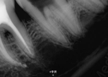患者,女,30岁,右下第一磨牙疼痛来诊。平素体质一般,无药物、食物过敏史,无高血压、心脏病等系统病史。近期出现冷热刺激痛,根尖脓肿。