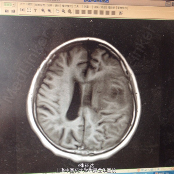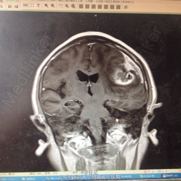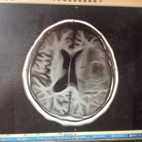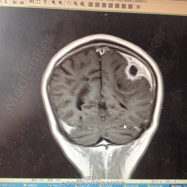 复查头颅MR表现为左侧顶叶占位。择期全麻下行手术治疗后取病理,提示脑脓肿