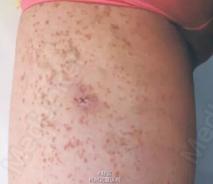 患者女,24岁。因右下肢褐色丘疹5年,无明显自觉症状。患者5年前无明显诱因于右大腿出现散在粟粒大小的褐色丘疹,无自觉症状,皮损逐渐增多,向小腿蔓延。