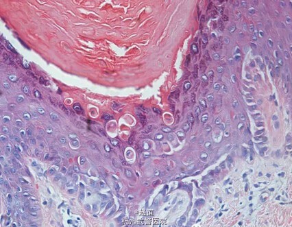 讨论:毛囊角化病为常染色体显性遗传病。本病常于儿童或青春期发病,无性别差异。典型皮损表现为棕红色、角化性、密集的丘疹或融合性斑块,上覆油腻性痂屑性痂皮,好发于头面、胸背等脂溢部位,口腔、咽、喉和食管黏膜,角膜,女性生殖器和肛门亦可受累,部分患者伴有掌跖角化过度和甲营养不良。线状毛囊角化病也称局限性Darier病、节段性Darier病,偶见沿Blaschko线分布,患者发病较晚,常无毛囊角化病的家族史,无指(趾)甲损害及其他症状。本病组织病理特征表现为基底层上棘刺松解性裂隙和特殊形态的角化不良。