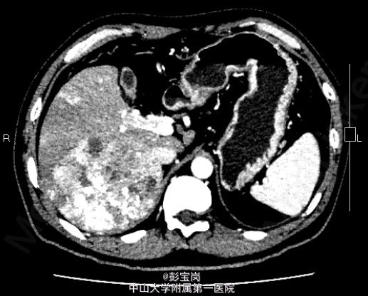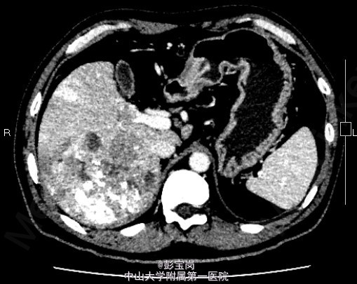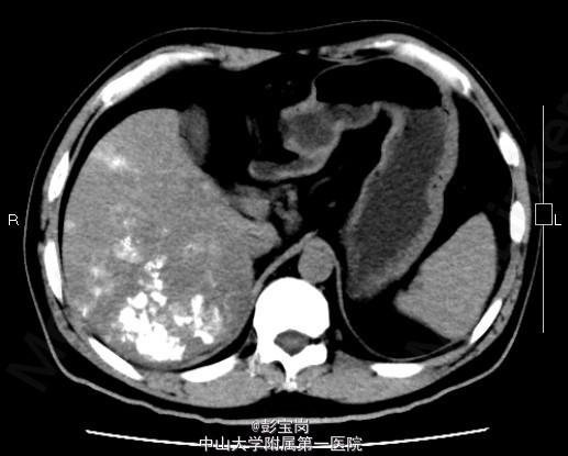 男性,42岁;因“肝癌行TACE术后,拟行手术治疗”入院。患者1月前体检发现原发性肝癌,于25天前在外院行肝动脉栓塞化疗(TACE)术。2天前患者就诊我院,查上腹CT示:右肝后叶多发结节或肿块,碘油栓塞后改变,病灶内和周边部仍有血供,门脉右后下支癌栓形成。现为进一步诊治门诊拟“肝细胞癌”收住我科。起病以来,精神食欲可,大小便通畅,体重无明显变化。既往史肾结石病史,否认肝炎病史。
